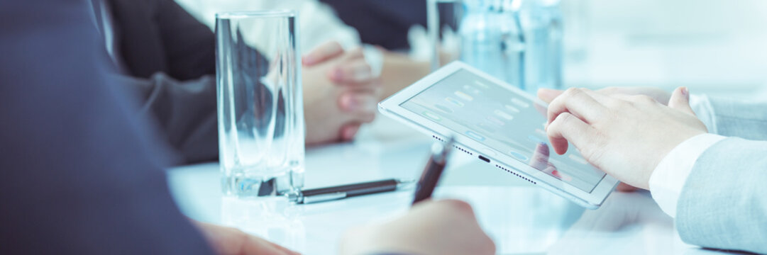 Group of multinational people shaking hands and digital technology concept. Wide angle visual for banners or advertisements
