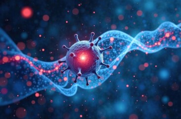 A digital illustration of colorful, molecular structures resembling viruses or cells, floating in a dark, 3D space with a blue glow effect.