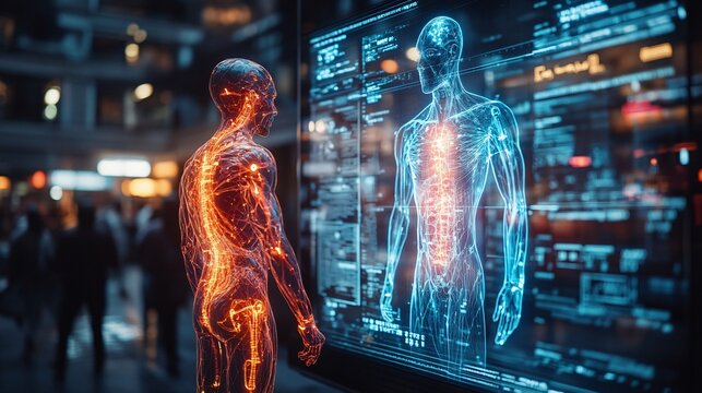 A health ID displayed on a transparent, holographic screen showing a person’s vitals and health status in real-time