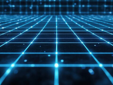A digital grid of bright blue lines extends into darkness with scattered small lights.