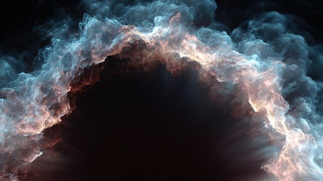 A glowing portal-like formation of ethereal, swirling clouds in blues, golds, and browns against a dark void