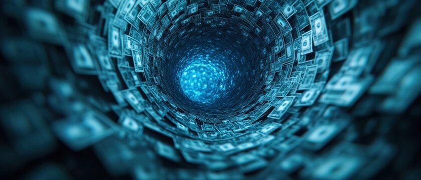 Abstract representation of vortex made of dollar bills, symbolizing wealth and finance, creating mesmerizing visual effect