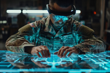 Soldier with high-tech helmet examines futuristic AI interface in dimly lit control room
