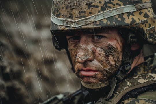 military man with a dirty face in a helmet and body armor in a trench in the rain. ai generative