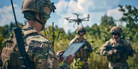 Cutting-edge military tactics. Combat strategist monitoring collaboration of army unit using unmanned aerial vehicles. Commander utilizing tablet with enhanced virtual interface