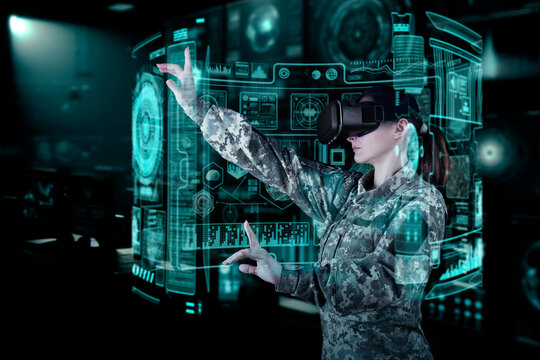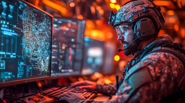 Military personnel in control room monitors tactical data on screens. Soldier wearing headset operates simulation technology, analyzing mission strategy, coordinating operations in modern defense