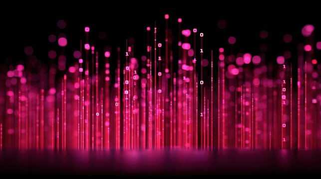 Abstract Digital Background with Pink Light Rays and Binary Code in a Dark Space for Technology and Data Visualization Concepts