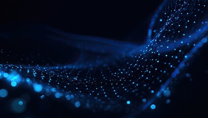 Futuristic flowing network of glowing white nodes and connecting lines forming an illuminated digital mesh across a dark background with soft spark-like highlights