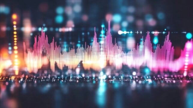 Vibrant digital display of soundwave patterns illustrates audio frequencies with colorful bars against a blurred background