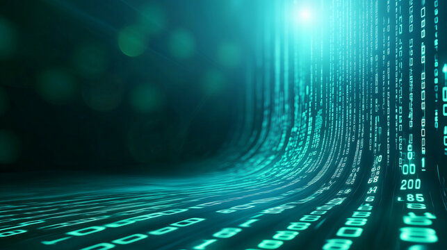 Abstract representation of flowing binary code on a dark background in a digital landscape