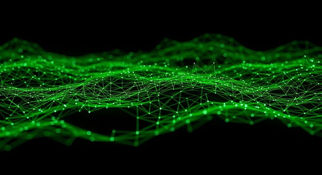 Abstract interweaving of points and lines of green shade. Visualization of particles form of waves. Large data background .3d rendering.