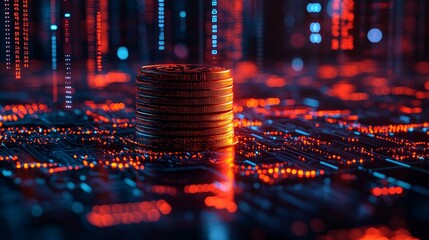 A 3D digital coin stack surrounded by flowing data streams, symbolizing digital wealth management