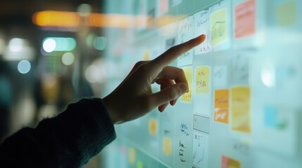 Businesswoman pointing at colorful sticky notes on an interactive whiteboard, strategizing and analyzing data in a modern office environment during nighttime hours