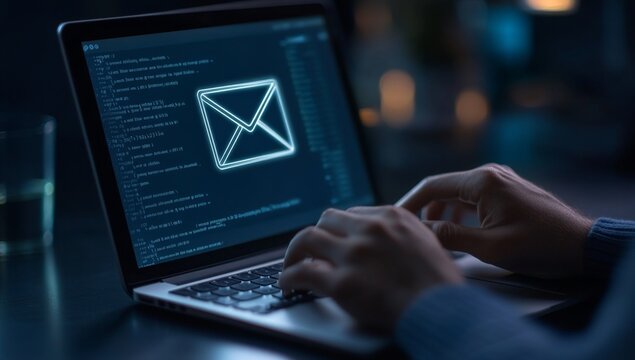 A hand holding a glowing digital email icon, with other icons floating in the background.