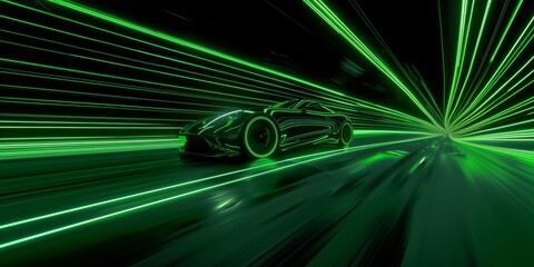 Futuristic electric sports car driving with high speed graphic speed lines through a tunnel in glowing green neon on dark background.. In Iron Style. Generative AI