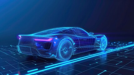 Futuristic electric car with holographic wireframe digital technology background
