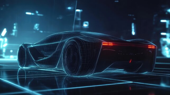Futuristic Wireframe Car Design with Neon Highlights and Dark Background