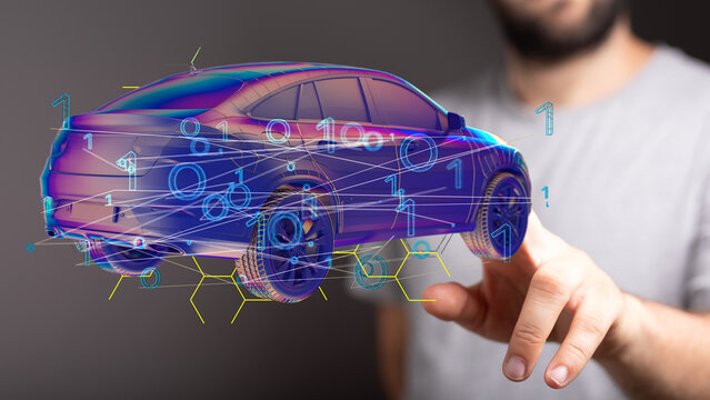 A digital representation of a car, showcasing a futuristic, wireframe design.
