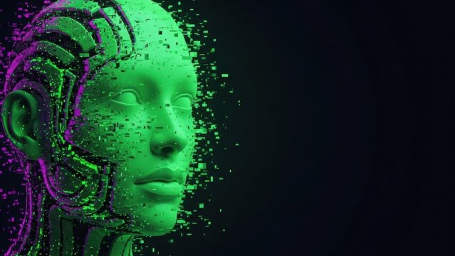 Abstract digital human face with pixelated decay. Concept of artificial intelligence, future technology, data science and virtual reality.