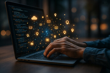 AI generated futuristic concept showing hands coding on laptop with glowing digital icons cloud network and abstract data stream symbolizing innovation and cyber technology