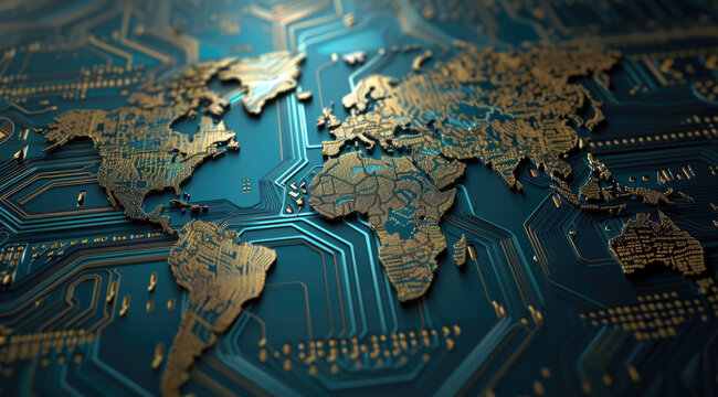 A glowing, orange digital world map overlays a dark, intricate circuit board, symbolizing global connectivity and technology.