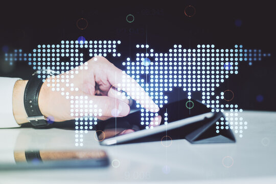 Double exposure of abstract digital world map and finger clicks on a digital tablet on background, research and strategy concept