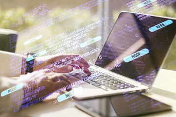 Multi exposure of abstract programming language hologram with world map and hands typing on computer keyboard on background, artificial intelligence and neural networks concept