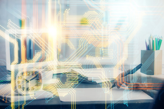 Multi exposure of table with computer and world map hologram. International data network concept.