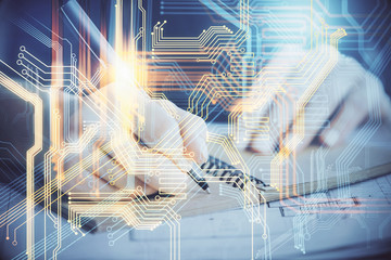 Microprocessor connections overlaying hacker using laptop