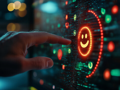 Exploring the digital world with a focus on interactive smiley icons and glowing interfaces at night