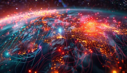World night view futuristic international telecommunication network, concept about global connection and information, background with colourful dynamic gradient line flows connecting between countries