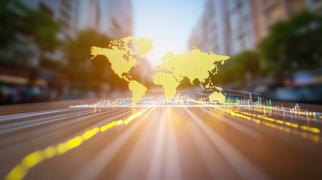 A digital world map overlay showing global financial data, market trends, and international trade connections above a modern city skyline, representing global business and economic networks.