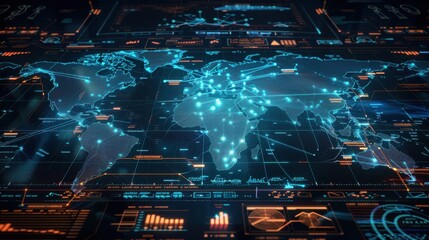 Neon blue digital world map with hexagonal clusters and cyber networks