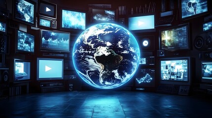 Earth in the middle of a bunch of television screens broadcasting a variety of different programs