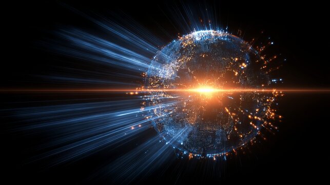 Glowing digital globe with data streams connecting continents representing global connectivity and technology innovation