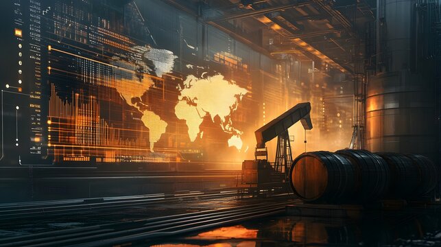 Oil pumping machinery in operation with barrels and digital screen with world map and financial chart graphs and indicators, natural resources stock market concept