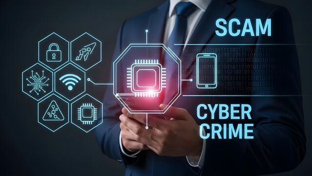 Illustration of businessman holding glowing digital document icon with shield overlay against abstract blue background featuring world map and data flow