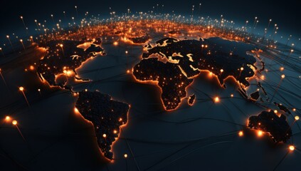 Digital world map with global communication nodes concept