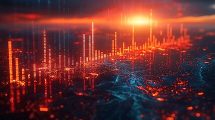 Vibrant abstract representation of financial markets with glowing data points, depicting a global network and digital information flow in red and orange hues, against a dark background.