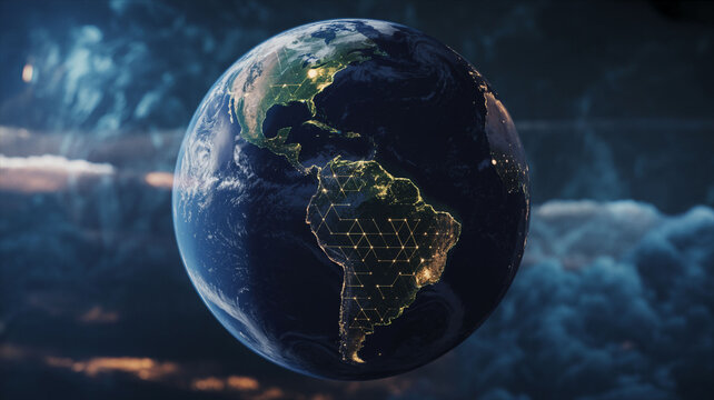 Earth from Space with Hexagonal Grid Network Connection