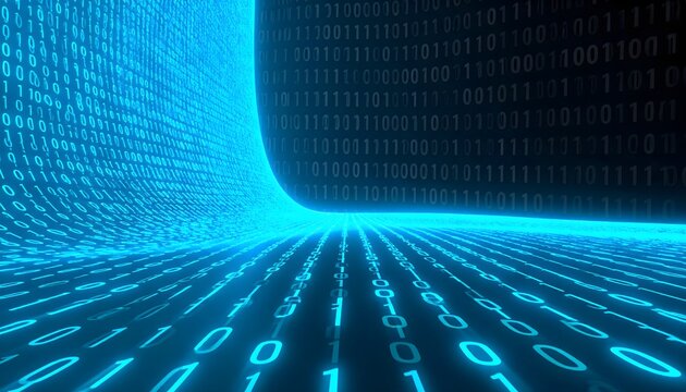 Futuristic digital landscape with a flowing river of glowing blue binary code, symbolizing the abstract concept of big data and cyberspace.