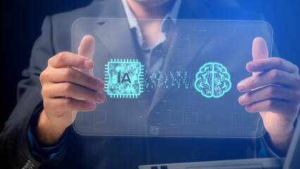 Cg tech collage. A business coach holds a transparent demonstration screen with a miniature of a digital human brain and an AI chip between which rays of information and binary code numbers move