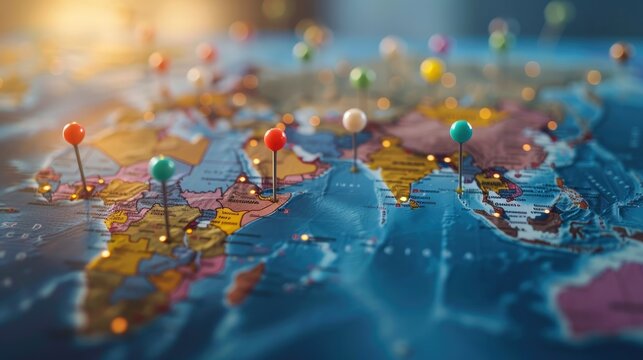 Hand hovering over interactive holographic world map with glowing location pins in a high-tech navigation interface digital workspace futuristic concept