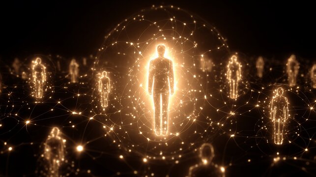 Digitally rendered figures depicted with connected dots, standing, glowing against dark