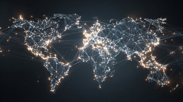 A digital map of the world with interconnected glowing points, illustrating global networks and data flow