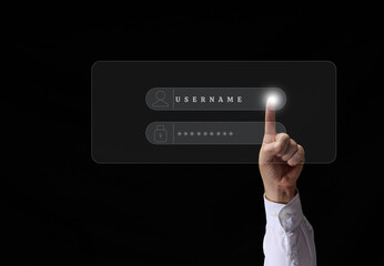 Human hand with screen login username and password for identity or sign-up register of cyber security internet access join social or personal data protection or forget pass key unlock.