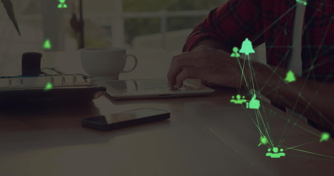 Two globes of digital icons spinning against mid section of a man using digital tablet at home