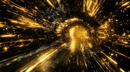 Golden light particles streaking through a dark, swirling tunnel, creating an abstract representation of high speed travel, digital data flow, or a futuristic wormhole