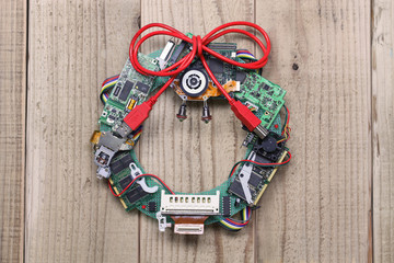 Grapevine wreath with red ribbon and beads on rustic wooden plank