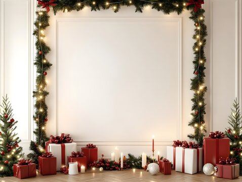 An empty digital backdrop for photography with a white wall, Christmas garland on the sides and at the top of the frame, lights, candles, and presents on the floor